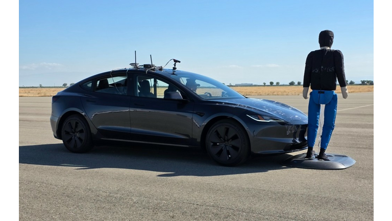 Testing was conducted on a closed course using a robotic pedestrian adult crossing in front of the test vehicles traveling at 25 mph. Tests were conducted during the day and night with the adult pedestrian dressed in both standard, non-reflective clothing and ANSI Class 3 high-visibility apparel.