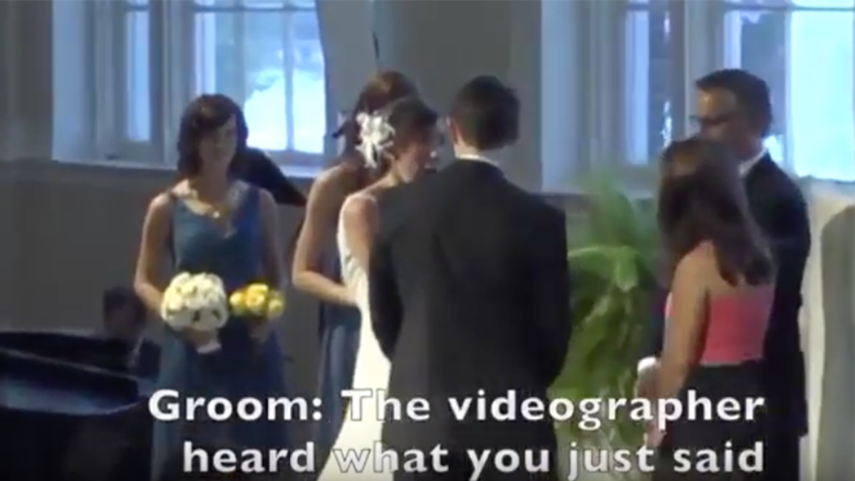 It happened during a song performance, after the groom whispered to his new wife that she looked amazing. Her response was that she "took a really big dump right before [she] came down the aisle." Holding back laughter, the groom jokingly asked, "What the hell is wrong with you?" He then let her know that he was wearing a microphone, adding, "Oops." She asked him why he was wired and he responded, "For moments like that," and noted that the videographer just heard everything she said.