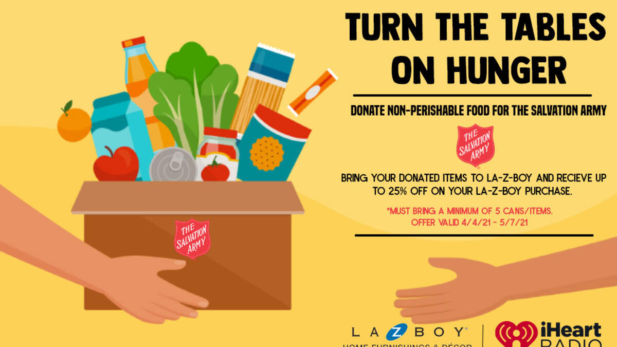 iHeartRadio has partnered with La-Z-Boy to Turn The Tables On Hunger! Help us stock the shelves at the Salvation Army Food Pantries in the Portland Metro area, Salem & Eugene with non-perishable food items. The Salvation Army helps cure hunger daily by providing food boxes and nutritious meals to anyone in need.